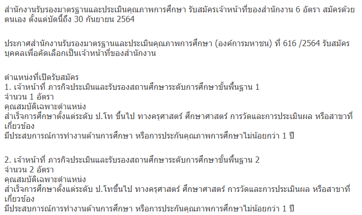กันยายน 16, 2021 spgroupthailand สำนักงานรับรองมาตรฐานและประเมินคุณภาพการศึกษา รับสมัครเจ้าหน้าที่ของสำนักงาน 6 อัตรา สมัครด้วยตนเอง ตั้งแต่บัดนี้ถึง 30 กันยายน 2564 รายละเอียดเพิ่มเติม-ไฟล์ประกาศรับสมัคร แบ่งปันสิ่งนี้: แชร์บน X(เปิดในหน้าต่างใหม่) X แชร์บน Facebook(เปิดในหน้าต่างใหม่) เฟซบุ๊ค ถูกใจ กำลังโหลด... ที่เกี่ยวข้อง