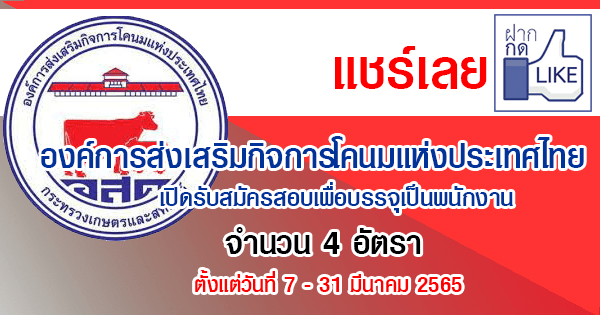 องค์การส่งเสริมกิจการโคนมแห่งประเทศไทย เปิดรับสมัครสอบเพื่อบรรจุเป็นพนักงาน 4 อัตรา รับสมัครทางอินเทอร์เน็ต ตั้งแต่วันที่ 7 – 31 มีนาคม 2565