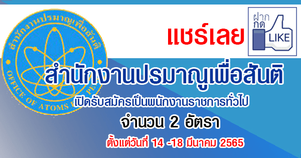สำนักงานปรมาณูเพื่อสันติ เปิดรับสมัครเป็นพนักงานราชการทั่วไป 2 อัตรา รับสมัครทางอินเทอร์เน็ต ตั้งแต่วันที่ 14 -18 มีนาคม 2565