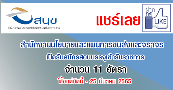 สำนักงานนโยบายและแผนการขนส่งและจราจร เปิดรับสมัครสอบบรรจุเข้ารับราชการ 11 อัตรา รับสมัครทางอินเทอร์เน็ต ตั้งแต่บัดนี้ – 25 มีนาคม 2565