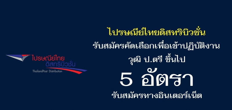 ประกาศบริษัท ไปรษณีย์ไทยดิสทริบิวชั่น จำกัด เรื่อง รับสมัครบุคคลเพื่อคัดเลือกเข้าปฏิบัติงานในบริษัท ไปรษณีย์ไทยดิสทริบิวชั่น จำกัด