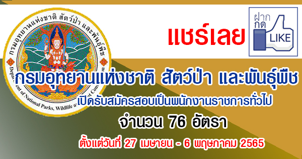 กรมอุทยานแห่งชาติ สัตว์ป่า และพันธุ์พืช เปิดรับสมัครสอบเป็นพนักงานราชการทั่วไป 76 อัตรา รับสมัครทางอินเทอร็เน็ต ตั้งแต่วันที่ 27 เมษายน – 6 พฤษภาคม 2565