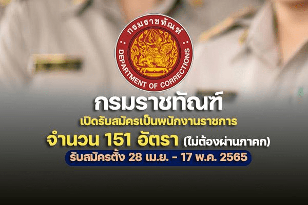 กรมราชทัณฑ์ เปิดรับสมัครสอบเป็นพนักงานราชการ 151 อัตรา รับสมัครทางอินเทอร์เน็ต ตั้งแต่วันที่ 26 เมษายน – 17 พฤษภาคม 2565