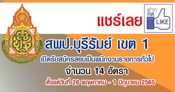 สพป.บุรีรัมย์ เขต 1 เปิดรับสมัครสอบเป็นพนักงานราชการทั่วไป 14 อัตรา รับสมัครทางอินเทอร์เน็ต ตั้งแต่วันที่ 26 พฤษภาคม – 1 มิถุนายน 2565