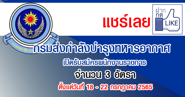 กรมส่งกำลังบำรุงทหารอากาศ เปิดรับสมัครพนักงานราชการ 3 อัตรา รับสมัครด้วยตนเอง ตั้งแต่วันที่ 18 – 22 กรกฎาคม 2565