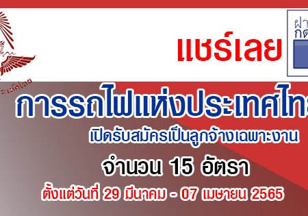 การรถไฟแห่งประเทศไทย เปิดรับสมัครเป็นลูกจ้างเฉพาะงาน จำนวน 15 อัตรา รับสมัครด้วยตนเอง ตั้งแต่วันที่ 29 มีนาคม – 07 เมษายน 2565
