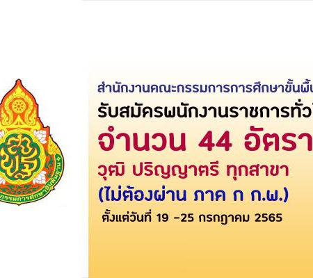 สำนักงานคณะกรรมการการศึกษาขั้นพื้นฐาน(สพฐ.) เปิดรับสมัครสอบเป็นพนักงานราชการทั่วไป 44 อัตรา รับสมัครทางอินเทอร์เน็ต ตั้งแต่วันที่ 19 – 25 กรกฎาคม 2565