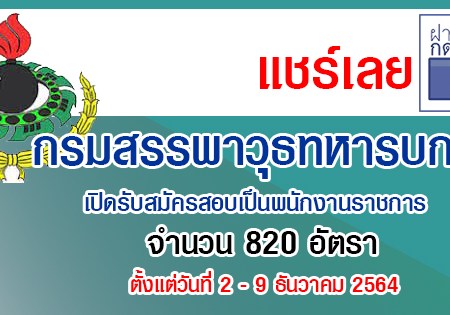 กรมสรรพาวุธทหารบก เปิดรับสมัครสอบเป็นพนักงานราชการ 820 อัตรา รับสมัครทางอินเตอร์เน็ต ตั้งแต่วันที่ 2 – 9 ธันวาคม 2564