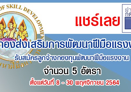 กองส่งเสริมการพัฒนาฝีมือแรงงาน รับสมัครลูกจ้างกองทุนพัฒนาฝีมือแรงงาน 5 อัตรา รับสมัครทาง E-mail ตั้งแต่วันที่ 8 – 30 พฤศจิกายน 2564