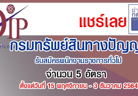 กรมทรัพย์สินทางปัญญา รับสมัครพนักงานราชการทั่วไป 5 อัตรา รับสมัครทางอินเทอร์เน็ต ตั้งแต่วันที่ 15 พฤศจิกายน – 3 ธันวาคม 2564