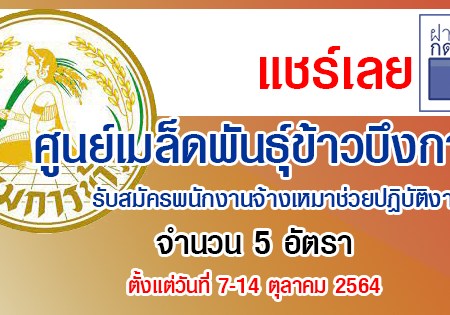 ศูนย์เมล็ดพันธุ์ข้าวบึงกาฬ รับสมัครพนักงานจ้างเหมาช่วยปฏิบัติงาน 5 อัตรา รับสมัครด้วยตนเอง ตั้งแต่วันที่ 7-14 ตุลาคม 2564