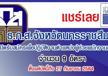 ธ.ก.ส.จังหวัดนครราชสีมา เปิดรับสมัครเพื่อปฏิบัติงานตําแหน่งผู้ช่วยพนักงานธุรการ 9 อัตรา รับสมัครทางอินเทอร์เน็ต ตั้งแต่บัตนี้ถึง 27 กันยายน 2564
