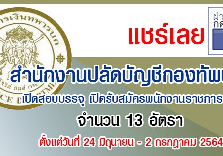 สำนักงานปลัดบัญชีกองทัพบก เปิดรับสมัครพนักงานราชการ 13 อัตรา รับสมัครทางไปรษณีย์ด่วนพิเศษ (EMS) ตั้งแต่วันที่ 24 มิถุนายน – 2 กรกฎาคม 2564