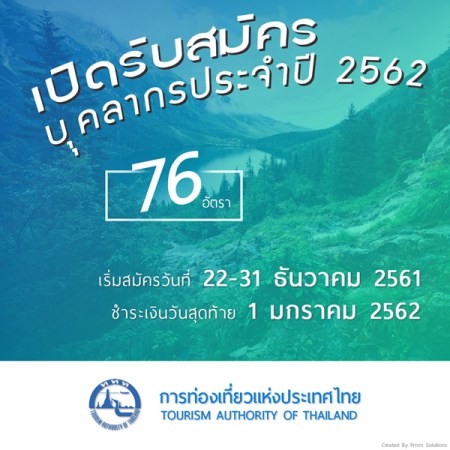 ธันวาคม 19, 2018 spgroupthailand การท่องเที่ยวแห่งประเทศไทย เตรียมเปิดรับสมัครบุคลากรประจำปี 2562 จำนวน 76 อัตรา รับสมัครทางอินเทอร์เน็ต ตั้งแต่วันที่ 22 – 31 ธันวาคม 2561