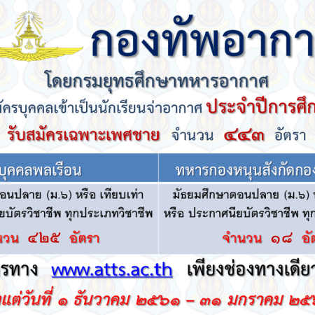 ตุลาคม 26, 2018 spgroupthailand เปิดรับสมัครสอบเข้าเป็น นักเรียนจ่าอากาศ ประจำปี 2562 จำนวน 443 อัตรา รับสมัครทางอินเทอร์เน็ต ตั้งแต่วันที่ 1 ธันวาคม 2561 – 31 มกราคม 2562