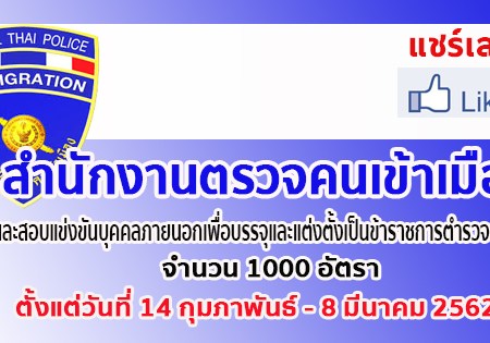 กุมภาพันธ์ 8, 2019 spgroupthailand เปิดรับสมัครสอบเป็นตำรวจตรวจคนเข้าเมือง (ตม.) ประจำปี 2562 จำนวน 1000 อัตรา รับสมัครด้วยตนเอง ตั้งแต่วันที่ 14 กุมภาพันธ์ – 8 มีนาคม 2562