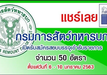 ธันวาคม 23, 2019 spgroupthailand กรมการสัตว์ทหารบก เปิดรับสมัครสอบบรรจุเข้ารับราชการ จำนวน 50 อัตรา รับสมัครด้วยตนเอง ตั้งแต่วันที่ 6 – 10 มกราคม 2563