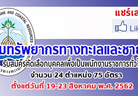 สิงหาคม 12, 2019 spgroupthailand กรมทรัพยากรทางทะเลและชายฝั่ง เปิดรับสมัครสอบเป็นพนักงานราชการ จำนวน 75 อัตรา รับสมัครทางอินเทอร์เน็ต ตั้งแต่วันที่ 19 – 23 สิงหาคม 2562