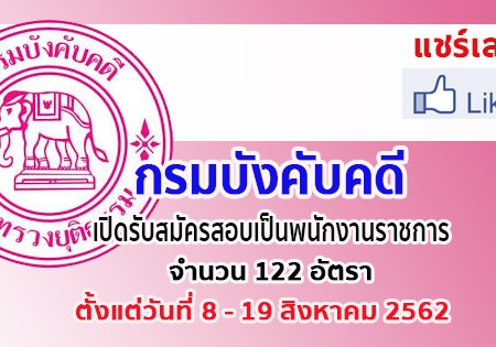 สิงหาคม 2, 2019 spgroupthailand กรมบังคับคดี เปิดรับสมัครสอบเป็นพนักงานราชการ จำนวน 122 อัตรา รับสมัครทางอินเทอร์เน็ต ตั้งแต่วันที่ 8 – 19 สิงหาคม 2562