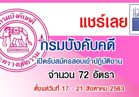 สิงหาคม 19, 2020 spgroupthailand กรมบังคับคดี เปิดรับสมัครสอบเข้าปฏิบัติงาน จำนวน 72 อัตรา รับสมัครด้วยตนเองและทางอีเมล์ ตั้งแต่วันที่ 17 – 21 สิงหาคม 2563
