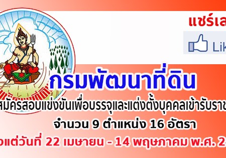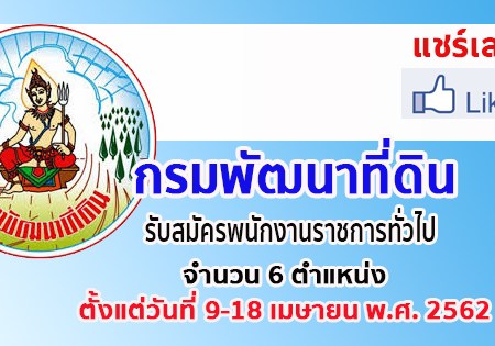 กรมพัฒนาที่ดิน รับสมัครสอบแข่งขันเพื่อบรรจุและแต่งตั้งบุคคลเข้ารับราชการ จำนวน 9 ตำแหน่ง 16 อัตรา สมัครออนไลน์ตั้งแต่วันที่ 22 เมษายน – 14 พฤษภาคม พ.ศ. 2562