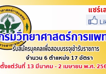 มีนาคม 12, 2019 spgroupthailand กรมวิทยาศาสตร์การแพทย์ เปิดรับสมัครสอบเพื่อบรรจุบุคคลเข้ารับราชการ จำนวน 17 อัตรา รับสมัครทางอินเทอร์เน็ต ตั้งแต่วันที่ 13 มีนาคม – 2 เมษายน 2562