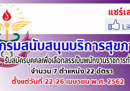 เมษายน 19, 2019 spgroupthailand กรมสนับสนุนบริการสุขภาพ รับสมัครบุคคลเพื่อเลือกสรรเป็นพนักงานราชการทั่วไป จำนวน 7 ตำแหน่ง 22 อัตรา สมัครออนไลน์ตั้งแต่วันที่ 22-26 เมษายน พ.ศ. 2562