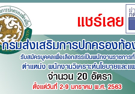 ธันวาคม 20, 2019 spgroupthailand กรมส่งเสริมการปกครองท้องถิ่น เปิดรับสมัครสอบเป็นพนักงานราชการ จำนวน 20 อัตรา สมัครทางอินเทอร์เน็ต ตั้งแต่วันที่ 2 – 9 มกราคม 2563