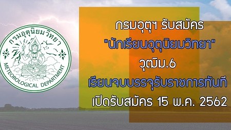 เมษายน 28, 2019 spgroupthailand กรมอุตุนิยมวิทยา เปิดรับสมัครสอบเป็นนักเรียนอุตุนิยมวิทยา จำนวน 50 อัตรา รับสมัครทางอินเทอร์เน็ต ตั้งแต่วันที่ 15 พฤษภาคม – 15 มิถุนายน 2562