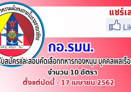 เมษายน 10, 2019 spgroupthailand กอ.รมน. รับสมัครและสอบคัดเลือกทหารกองหนุน บุคคลพลเรือน บรรจุเป็นนายทหารประทวน จำนวน 10 อัตรา ตั้งแต่บัดนี้ – 17 เมษายน 2562