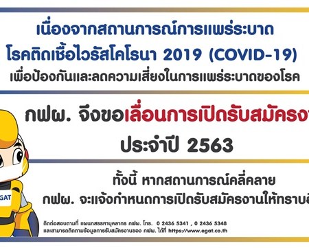 มีนาคม 30, 2020 spgroupthailand การไฟฟ้าฝ่ายผลิตแห่งประเทศไทย (กฟผ.) เลื่อนเปิดรับสมัครสอบบรรจุเป็นพนักงานปี 2563