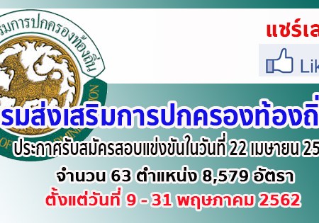 เมษายน 19, 2019 spgroupthailand คณะกรรมการกลางการสอบแข่งขันพนักงานส่วนท่องถิ่น (กสถ.) มีมติกำหนดให้มีการประกาศรับสมัครสอบแข่งขันในวันที่ 22 เมษายน 2562 จำนวน 63 ตำแหน่ง 8,579 อัตรา โดยรับสมัครระหว่างวันที่ 9 – 31 พฤษภาคม 2562