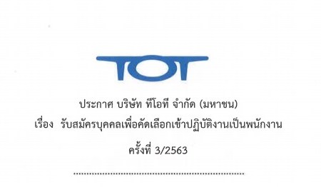 มีนาคม 15, 2019 spgroupthailand บริษัท ทีโอที จำกัด เปิดรับสมัครสอบเป็นพนักงาน ครั้งที่ 2/2562 รับสมัครทางอินเทอร์เน็ต ตั้งแต่บัดนี้จนถึงวันที่ 3 เมษายน 2562
