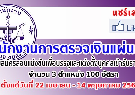 เมษายน 10, 2019 spgroupthailand สำนักงานการตรวจเงินแผ่นดิน (สตง.) เปิดรับสมัครสอบเพื่อบรรจุบุคคลเข้ารับราชการ จำนวน 100 อัตรา รับสมัครทางอินเทอร์เน็ต ตั้งแต่วันที่ 22 เมษายน – 14 พฤษภาคม 2562