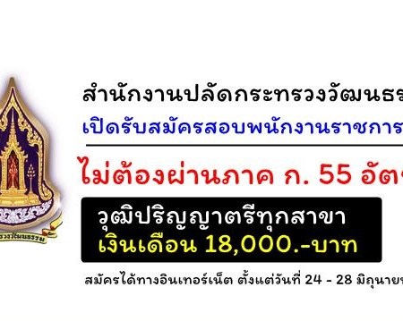 สำนักงานปลัดกระทรวงวัฒนธรรม เปิดรับสมัครสอบเพื่อเลือกสรรเป็นพนักงานราชการ จำนวน 55 อัตรา รับสมัครทางอินเทอร์เน็ต ตั้งแต่วันที่ 26 มิถุนายน – 2 กรกฎาคม 2562