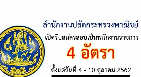 สำนักงานปลัดกระทรวงพาณิชย์ เปิดรับสมัครสอบเป็นพนักงานราชการ จำนวน 4 อัตรา รับสมัครทางอินเทอร์เน็ต ตั้งแต่วันที่ 4 – 10 ตุลาคม 2562