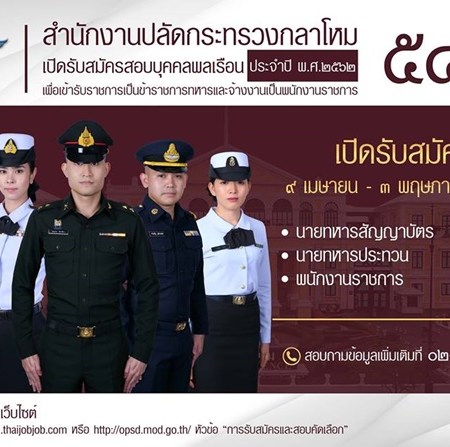 สำนักงานปลัดกระทรวงกลาโหม เปิดรับสมัครสอบบรรจุบุคคลเข้ารับราชการ และเป็นพนักงานราชการ จำนวน 54 อัตรา รับสมัครทางอินเทอร์เน็ต ตั้งแต่วันที่ 9 เมษายน – 3 พฤษภาคม 2562
