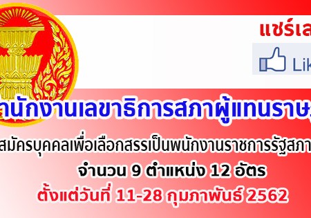 กุมภาพันธ์ 11, 2019 spgroupthailand สำนักงานเลขาธิการสภาผู้แทนราษฎร รับสมัครบุคคลเพื่อเลือกสรรเป็นพนักงานราชการรัฐสภาทั่วไป จำนวน 9 ตำแหน่ง 12 อัตรา สมัครออนไลน์ตั้งแต่วันที่ 11-28 กุมภาพันธ์ 2562