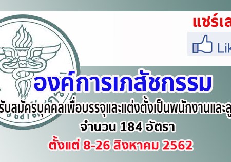 สิงหาคม 7, 2019 spgroupthailand องค์การเภสัชกรรม เปิดรับสมัครสอบบรรจุเป็นพนักงานและลูกจ้าง จำนวน 184 อัตรา รับสมัครทางอินเทอร์เน็ต ตั้งแต่วันที่ 8 – 26 สิงหาคม 2562