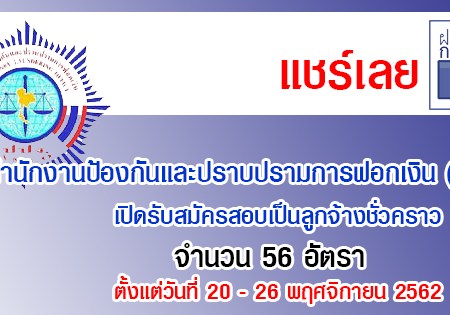 พฤศจิกายน 25, 2019 spgroupthailand สำนักงานป้องกันและปราบปรามการฟอกเงิน (ปปง.) เปิดรับสมัครสอบเป็นลูกจ้างชั่วคราว จำนวน 56 อัตรา รับสมัครด้วยตนเอง ตั้งแต่วันที่ 20 – 26 พฤศจิกายน 2562